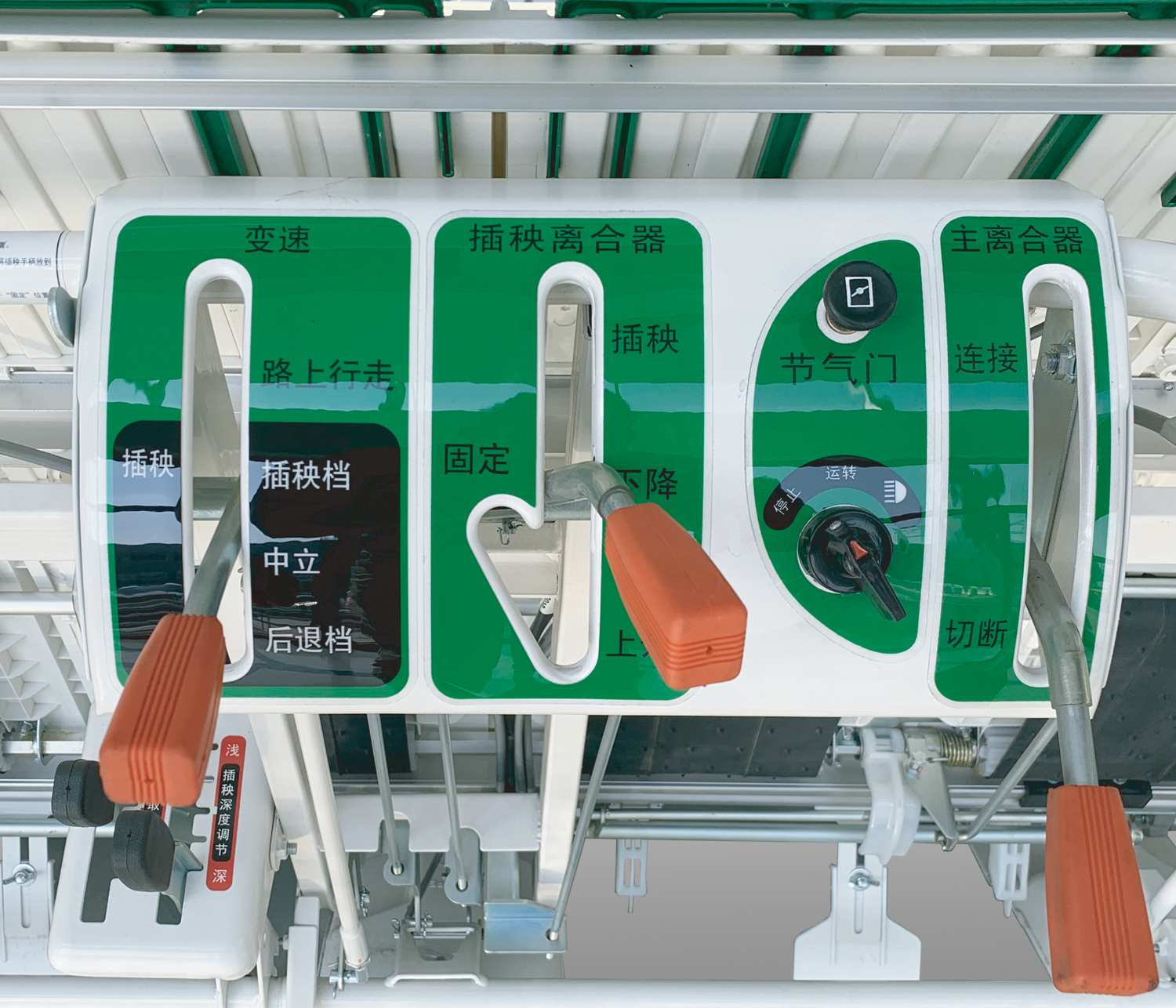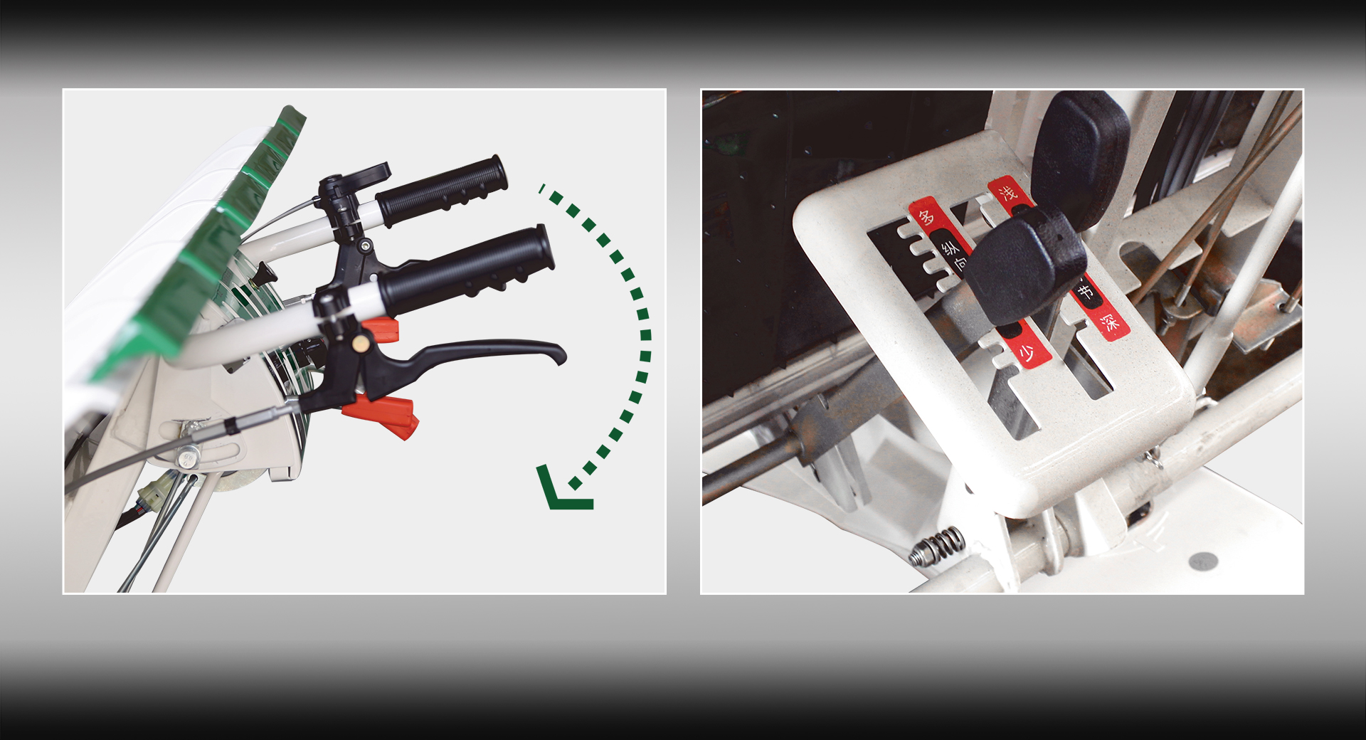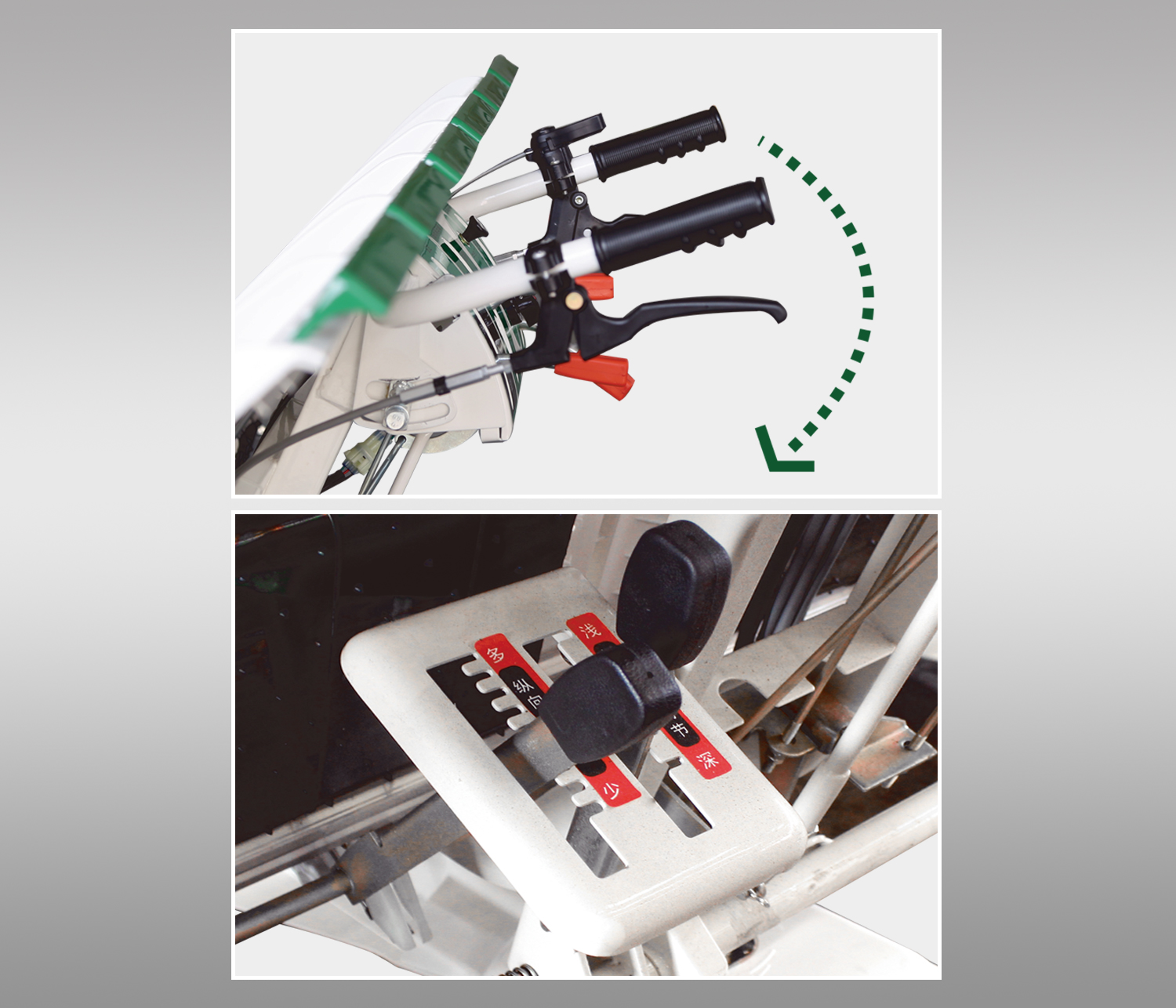 手把高度可調(diào),機(jī)手操作更舒適; 配備3種橫向取苗量齒輪及9級(jí)縱向取苗量檔位,取苗量調(diào)節(jié)范圍大; 加強(qiáng)型插深調(diào)節(jié)手柄,強(qiáng)度提高50%。